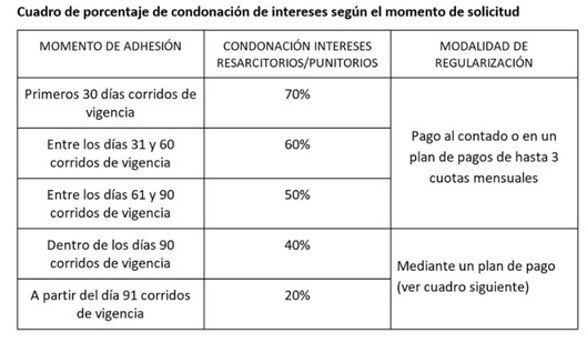 - Planes de hasta tres cuotas mensuales, con la mayor condonación de intereses (desde el 70% hasta el 50% según el momento en que se soliciten) cuya tasa de interés de financiación se encontrará definida en función del carácter del contribuyente.